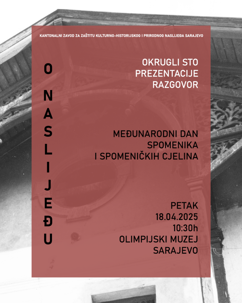 OKRUGLI STOL- PREZENTACIJE, RAZGOVORI bit će održan u petak 18. 05. 2025. godine u Olimpiskom muzeju Sarajevo. Na okruglom stolu učešće će uzeti eminentni stručnjaci iz oblasti zaštite naslijeđa.
