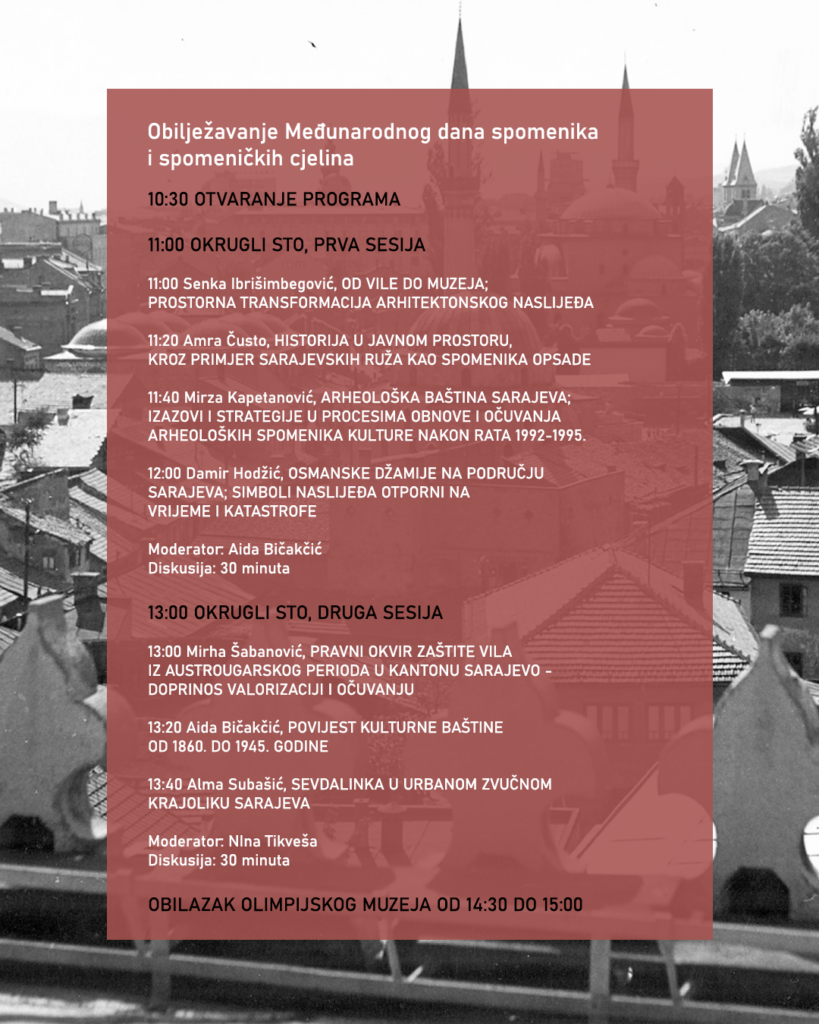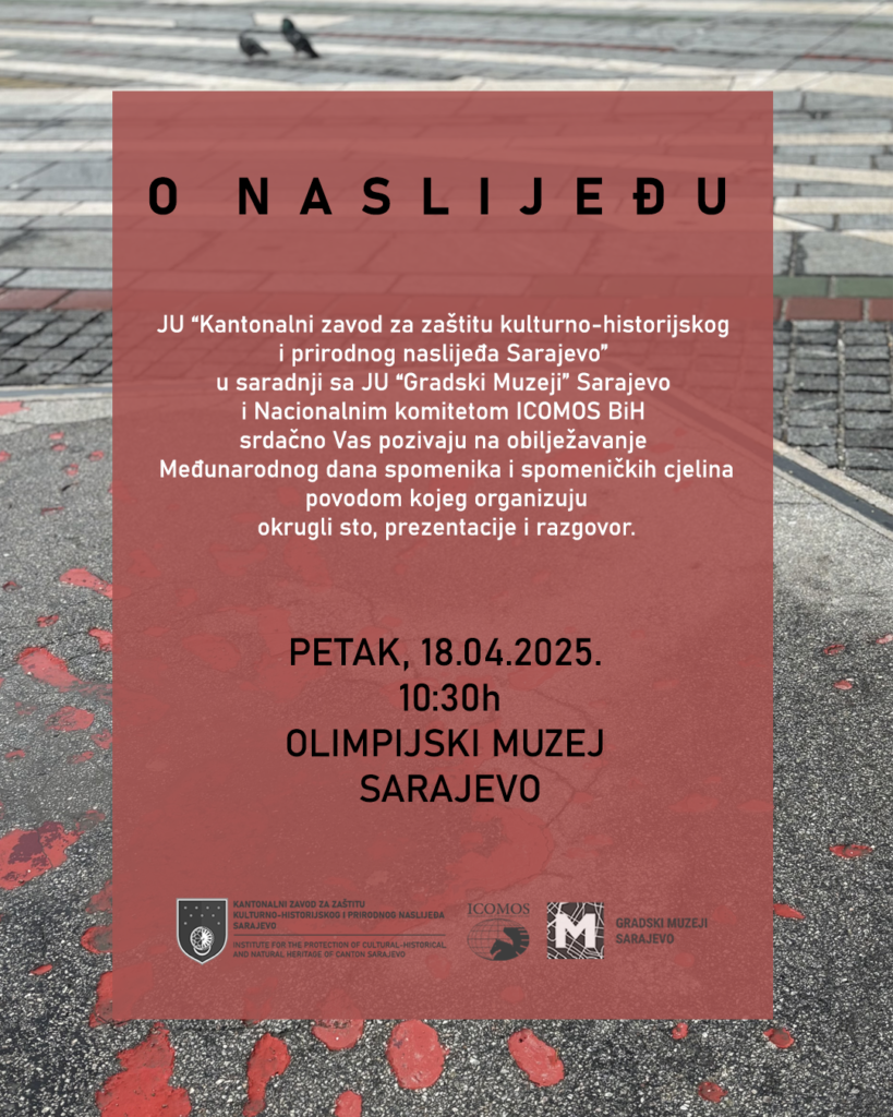 Srdačno vas pozivamo na obilježavanje Međunarodnog dana spomenika i spomeničkih cjelina u organizaciji JU „Kantonalni zavod za zaštitu kulturno-historijskog i prirodnog naslijeđa“ Sarajevo u saradnji sa JU „Gradski Muzeji“ Sarajevo i Nacionalnim komitetom ICOMOS BiH.